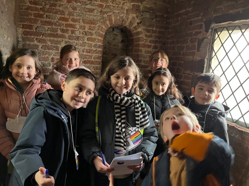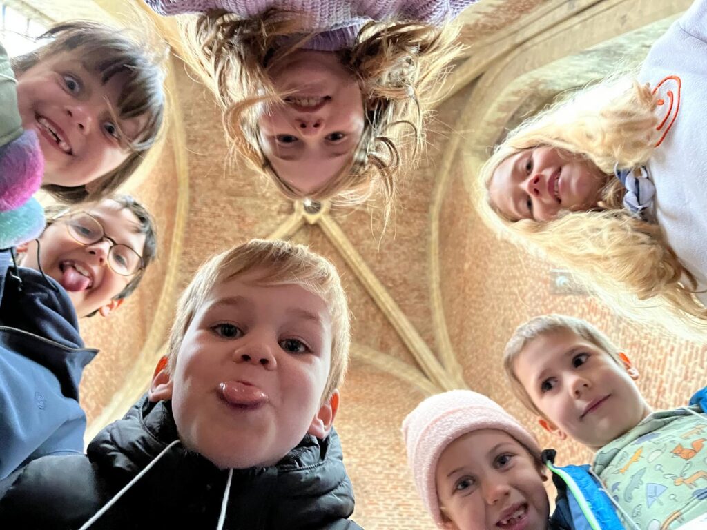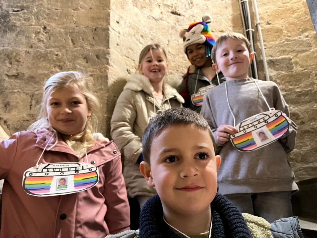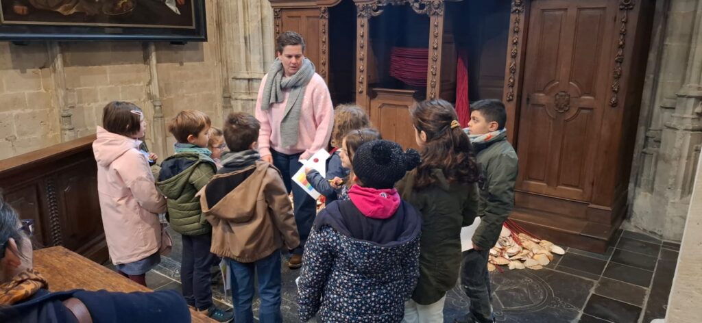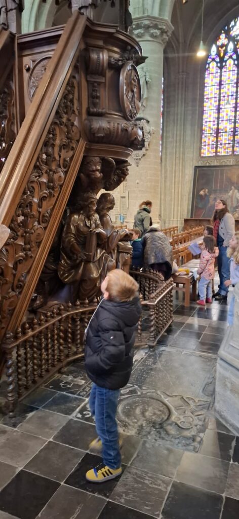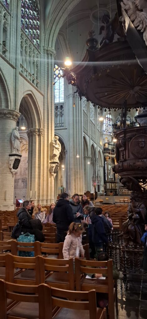 Zo kwamen ze op hun weg een vreemde stoel tegen met vier mensen (zouden dat de evangelisten zijn? En wat doen die dieren hier dan?). De kinderen konden luisteren in een schelp aan de halte ‘Liefhebben met schelpen en rode draden’. Bij de inkom van de kerk vonden ze het woord ‘VREDE’ in verschillende talen. Onze-Lieve-Vrouw van Zon nodigde uit om een kaarsje te branden en een gebedje te schrijven. En wie zijn toch die beelden op de zuilen in de kerk? In de sacristie gingen alle kasten open en werden kazuifels, kaarsen, bekers en schaaltjes ontdekt. En de deur van de klokkentoren werd opengegooid, de trappen werden beklommen en vanuit de hoogte konden ouders en kinderen een blik werpen op de omgeving.