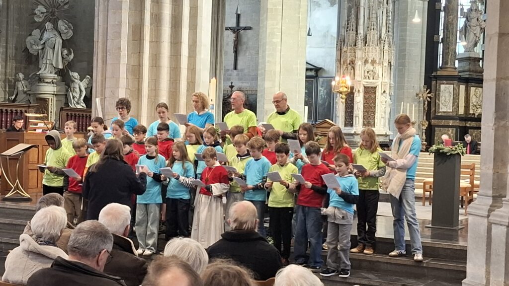 En precies op deze dag stonden 29 vormelingen vooraan in de kerk. In groep namen ze plaats op de trappen van het planum, gekleed in hun vrolijke kleurrijke vormsel T-shirts. Ze waren goed voorbereid. In de catechesegroepjes hadden ze eerder deze week al gesproken over de naamopgave. Wat betekent een naamopgave eigenlijk? Waarom doen we dat? Per groepje vertelde één van hen wat hun bevindingen waren. ‘We geven onze naam op omdat wij gelovig zijn en Jezus en zijn volgelingen beter willen leren kennen.’ Of ‘We geven onze naam op omdat onze ouders katholiek zijn, en wij willen bijleren over God.’ Ook dankbaarheid kwam aan bod, ‘omdat onze ouders ons onze eerste communie hebben laten doen.’ Een beetje zenuwachtig en haastig gaven ze de micro door aan elkaar. En één voor één klonken hun namen. De weddenschap om op dit moment stiekem een dansje te doen, werd bij deze verloren. Want hoe jong ze ook zijn, ze beseffen maar al te goed dat dit een plechtig moment is.